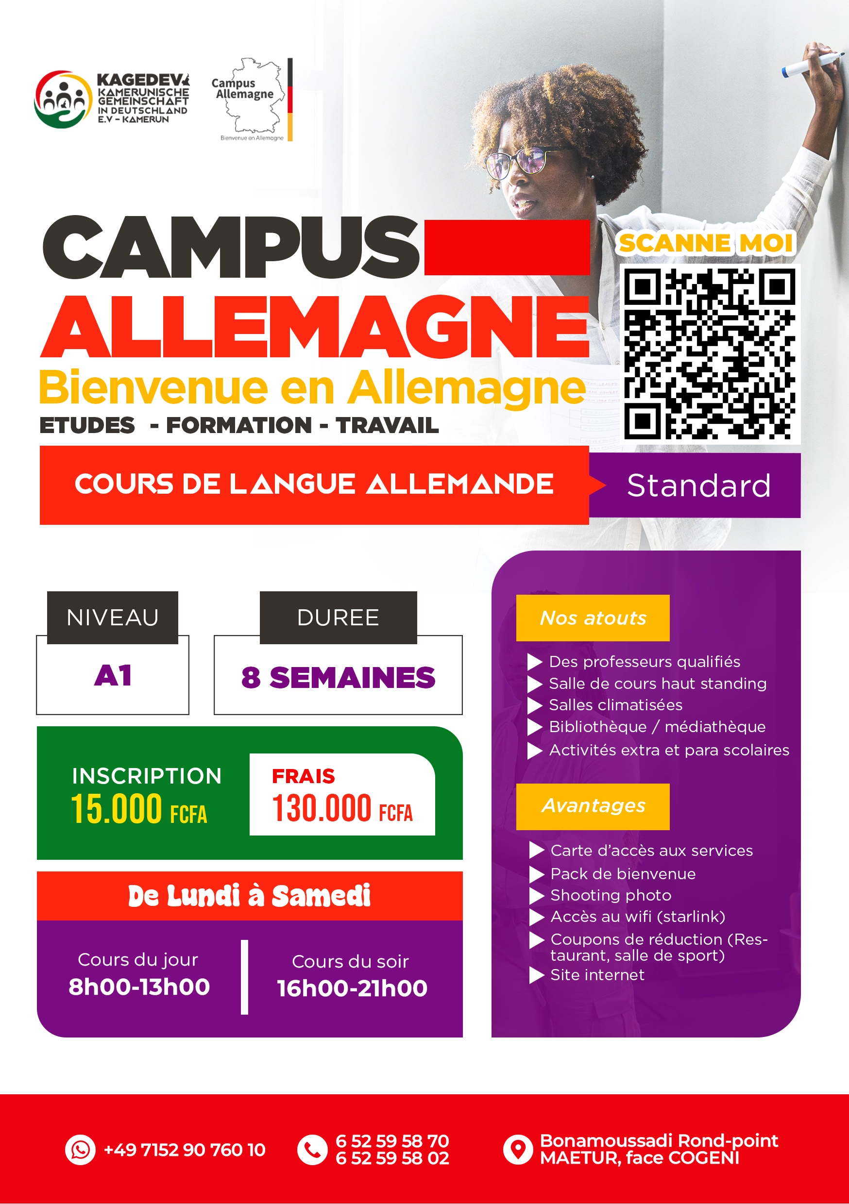 Plongez dans le cours d’allemand A1 du DZK, la porte d’entrée idéale vers le prestigieux programme Campus Allemagne | Autriche de KAGEDEV. Grâce à une pédagogie immersive, vous apprendrez à communiquer dans les situations quotidiennes tout en découvrant les bases culturelles indispensables pour étudier ou travailler en Allemagne ou en Autriche. Ce programme A1 pose les fondations linguistiques nécessaires pour intégrer ensuite les parcours certifiants, les orientations professionnelles et l’accompagnement personnalisé offerts par Campus Allemagne | Autriche. Avec des enseignants qualifiés, des ressources modernes et une progression rapide, démarrez votre aventure vers l’Europe en toute confiance.